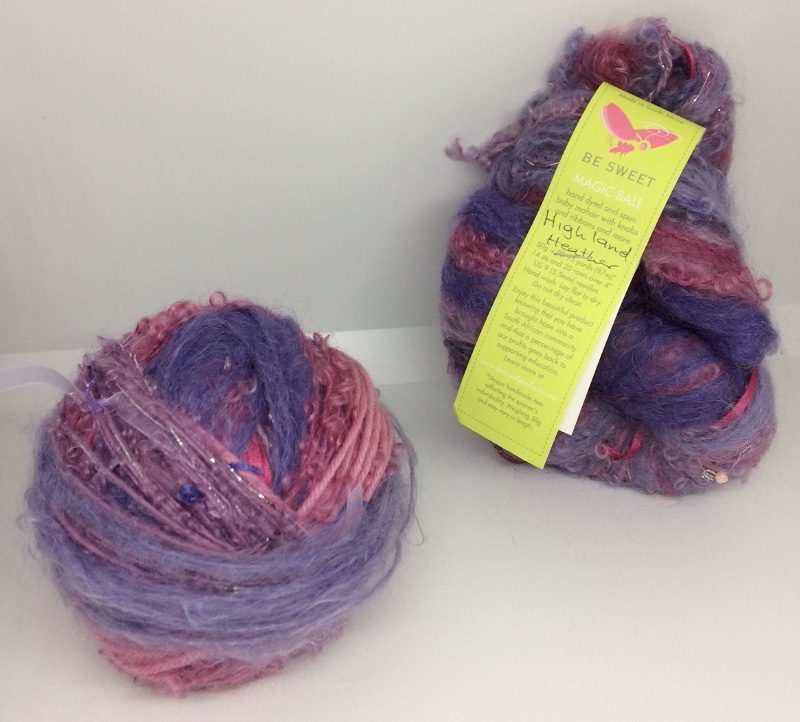 Magic Ball yarn is a divine arrangement of hand dyed boucle and brushed mohair yarns tied with knobby, ribbon, and metallic goodies. Its available in 50 different lovely colors!